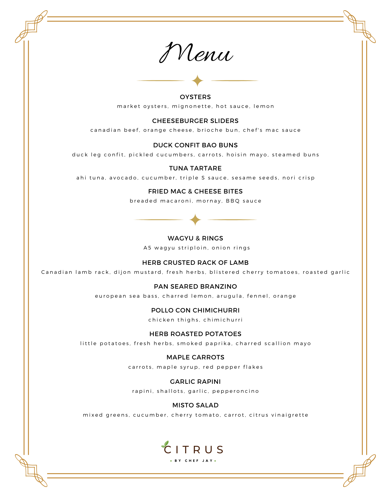 We build custom menus for every event based on your vision, style, and preferences of you and your guests.
